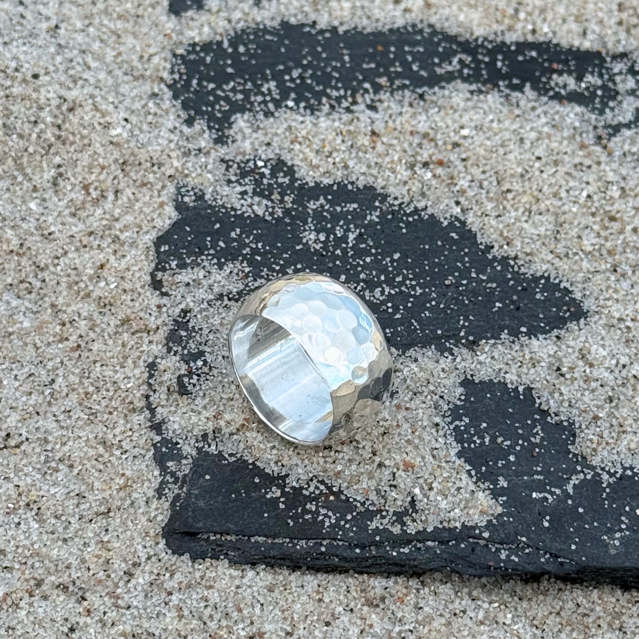 Onze prachtige gehamerde zilveren ring schittert in zilver aan uw vinger. Het bijzondere is de gelijkmatige hamerslag. Het is voor u gemaakt van hoogwaardig 925 sterling zilver